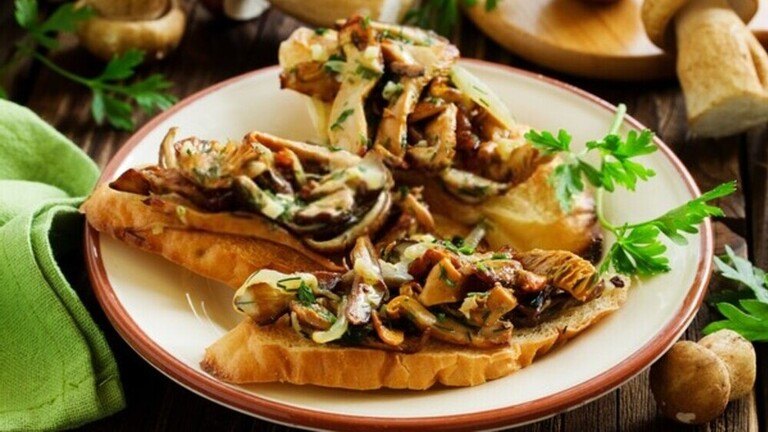 Scrub one side of each bread slice with cut sides of the garlic clove, then paste mushroom mixture over each slice, top with cheese. Ready to serve.